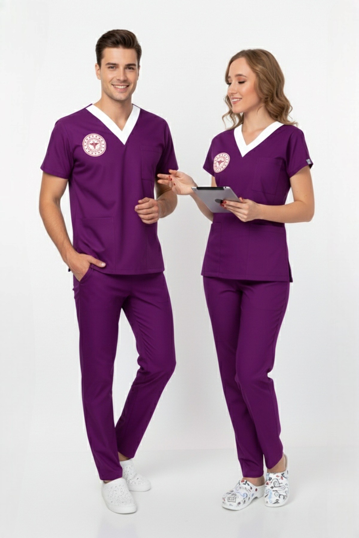 mor scrubs takım, byzantium scrubs, sorumlu ebe forması, ebe kıyafeti scrubs, unisex scrubs takım, pantone 19-3138 tcx forma, likralı sağlık forması, nefes alan scrubs, kadın doğum forması, yeni doğan ünitesi kıyafeti, sağlık personeli üniforması