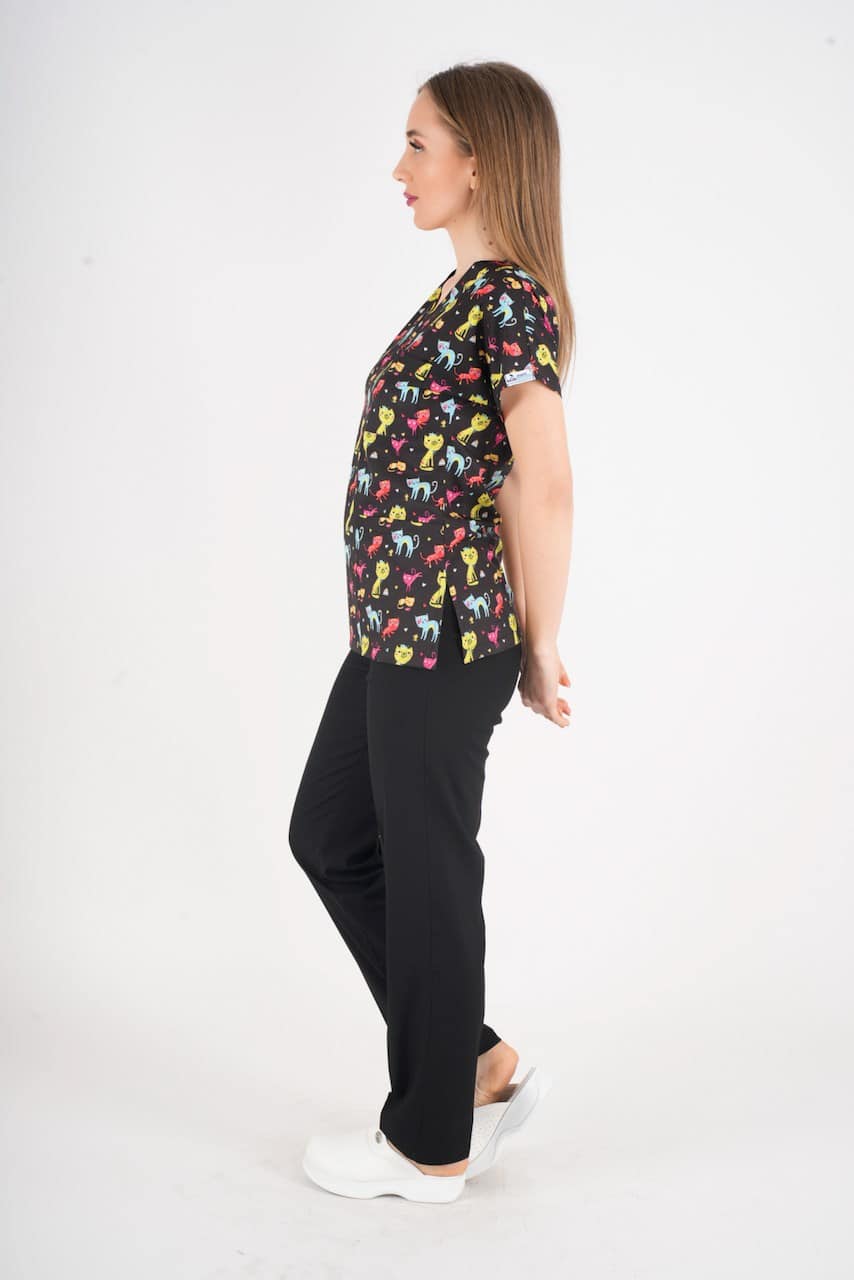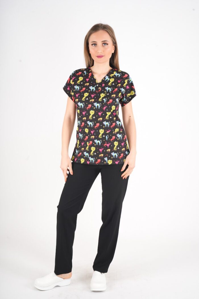 Unisex Cool Cats Club Desenli Doktor Hemşire Hastane Aşçı Mutfak Scrubs Üniforma Takım